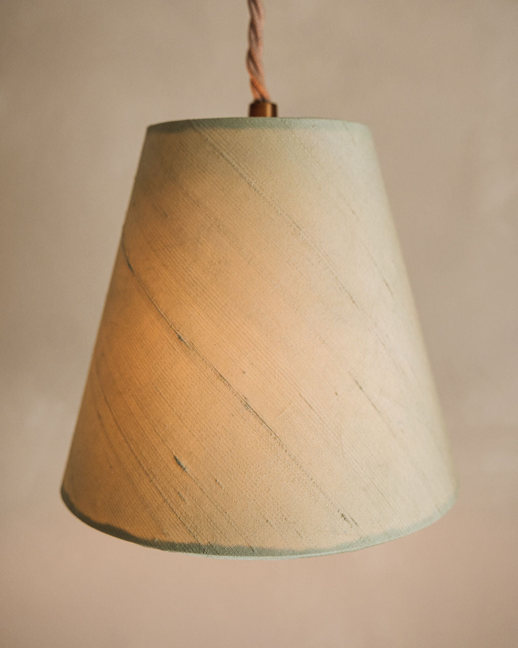 Silk candlestick lampshade. Hand made and hand dyed with fresh indigo to give a light green colour.