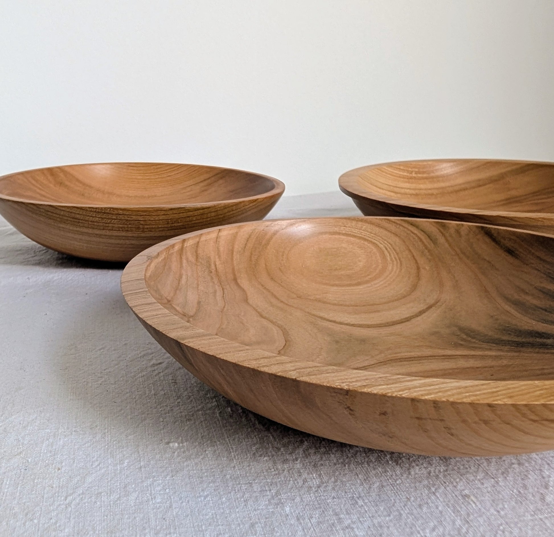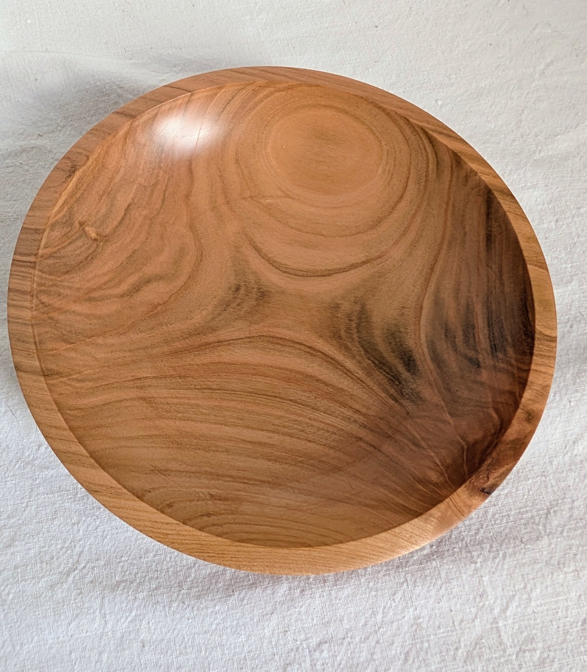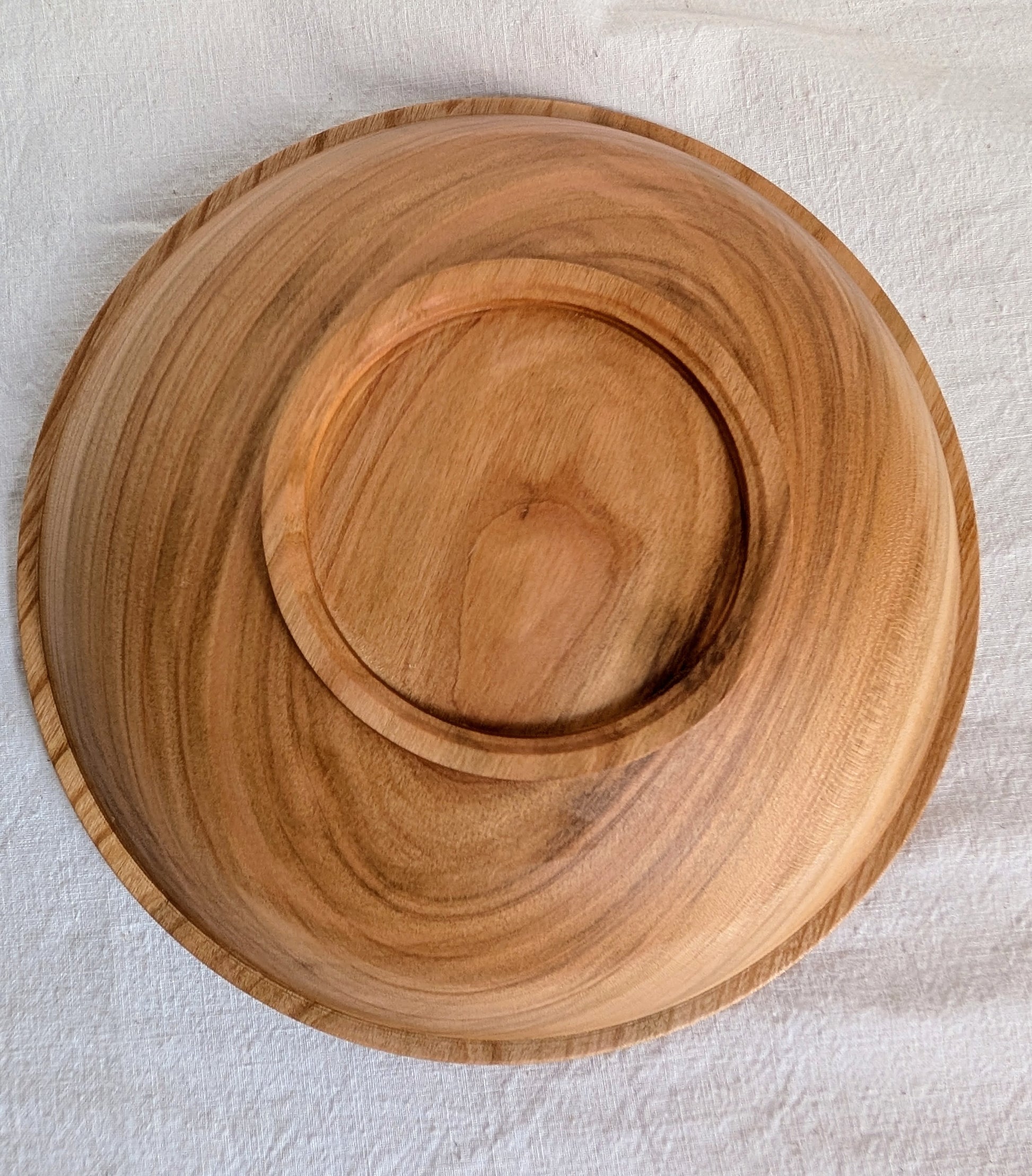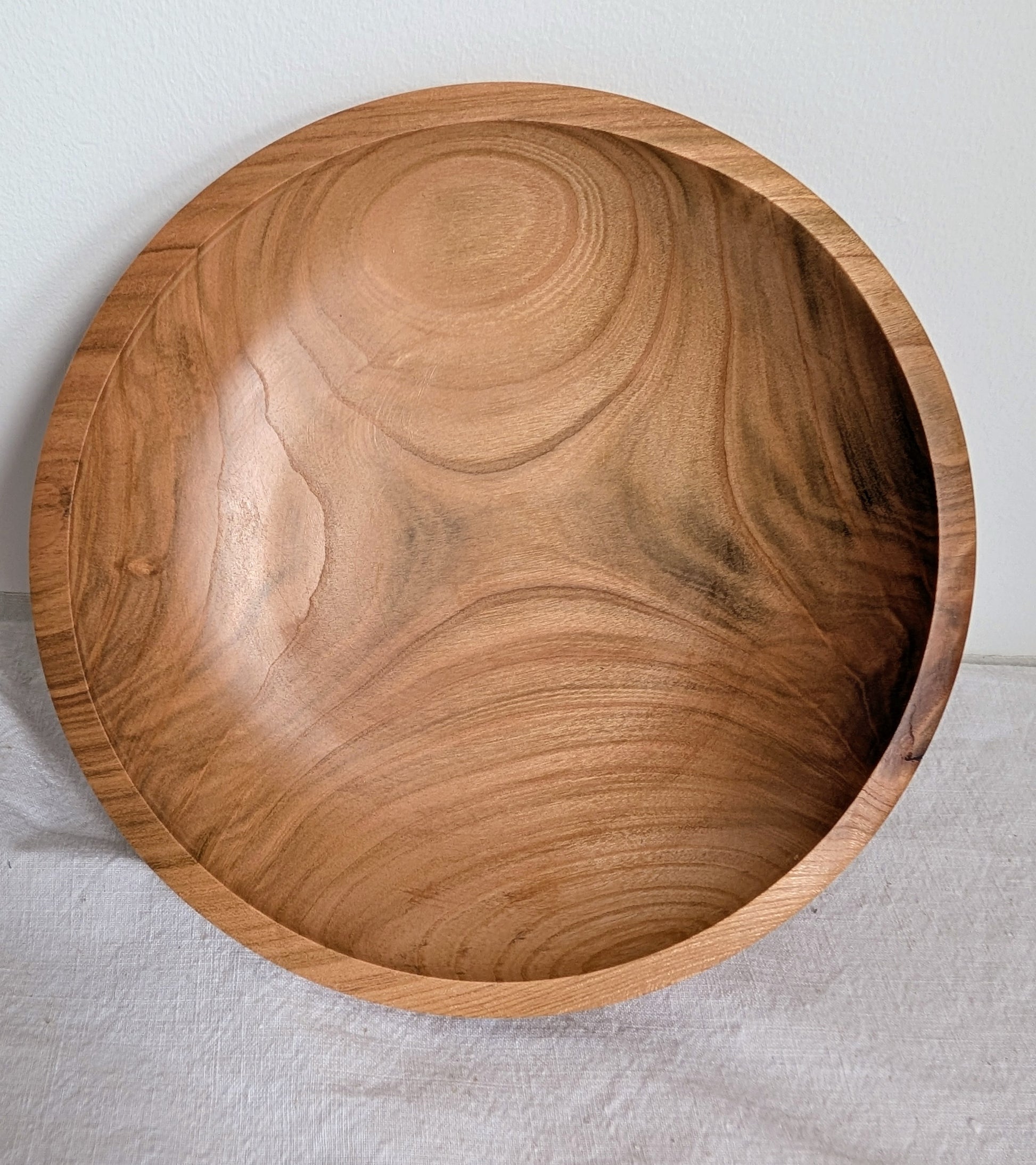 - Bowl B has a wider, flat edge, but no lip. The wood has a figure like a cross in the bowl, and a simple flat base.