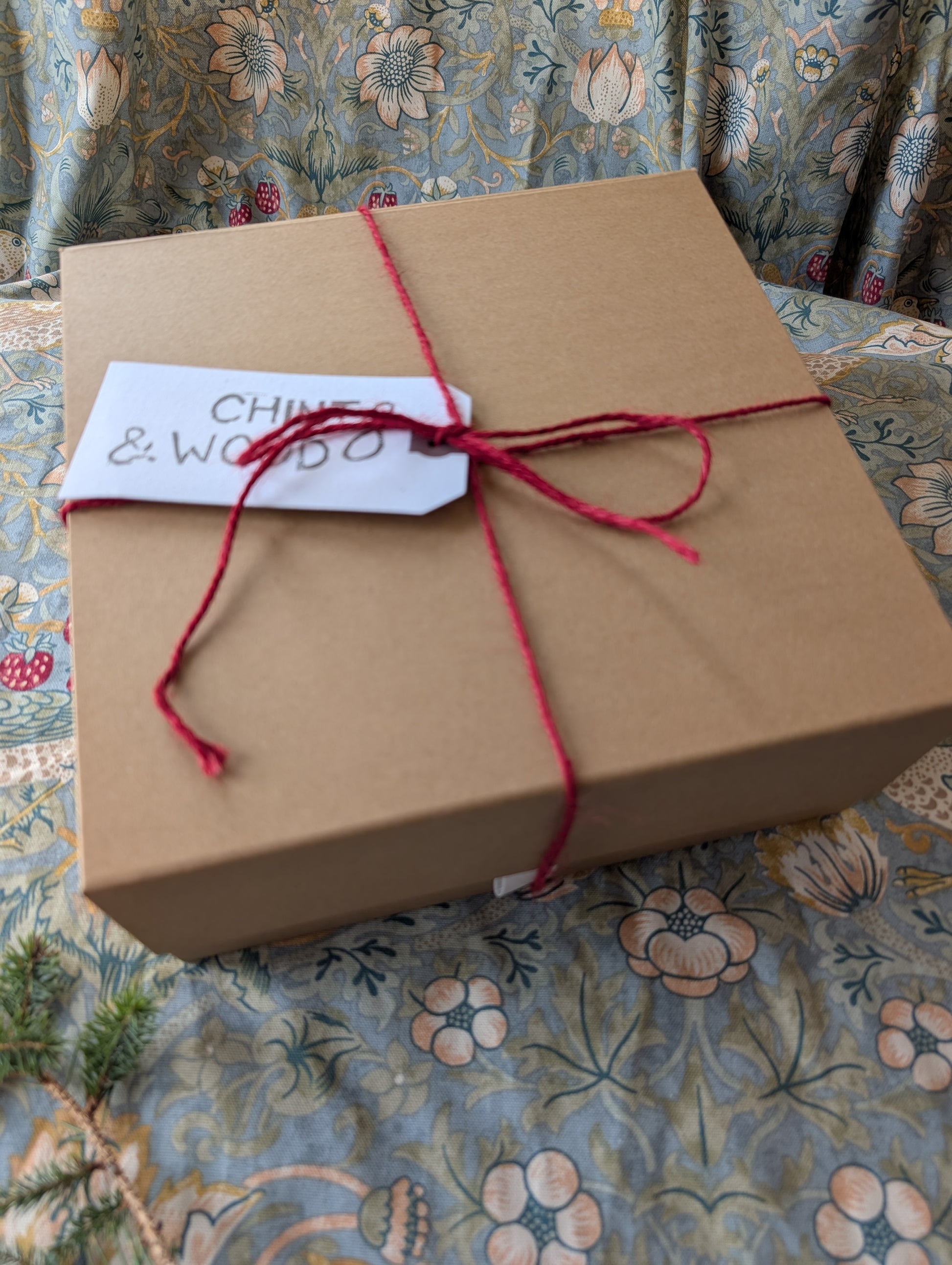 The trees are nestled in a bed of wood wool within a sturdy Kraft cardboard box, which has a magnetic closure. The box is tied in a festive bow with red jute cord, and has a Chintz & Wood tag.