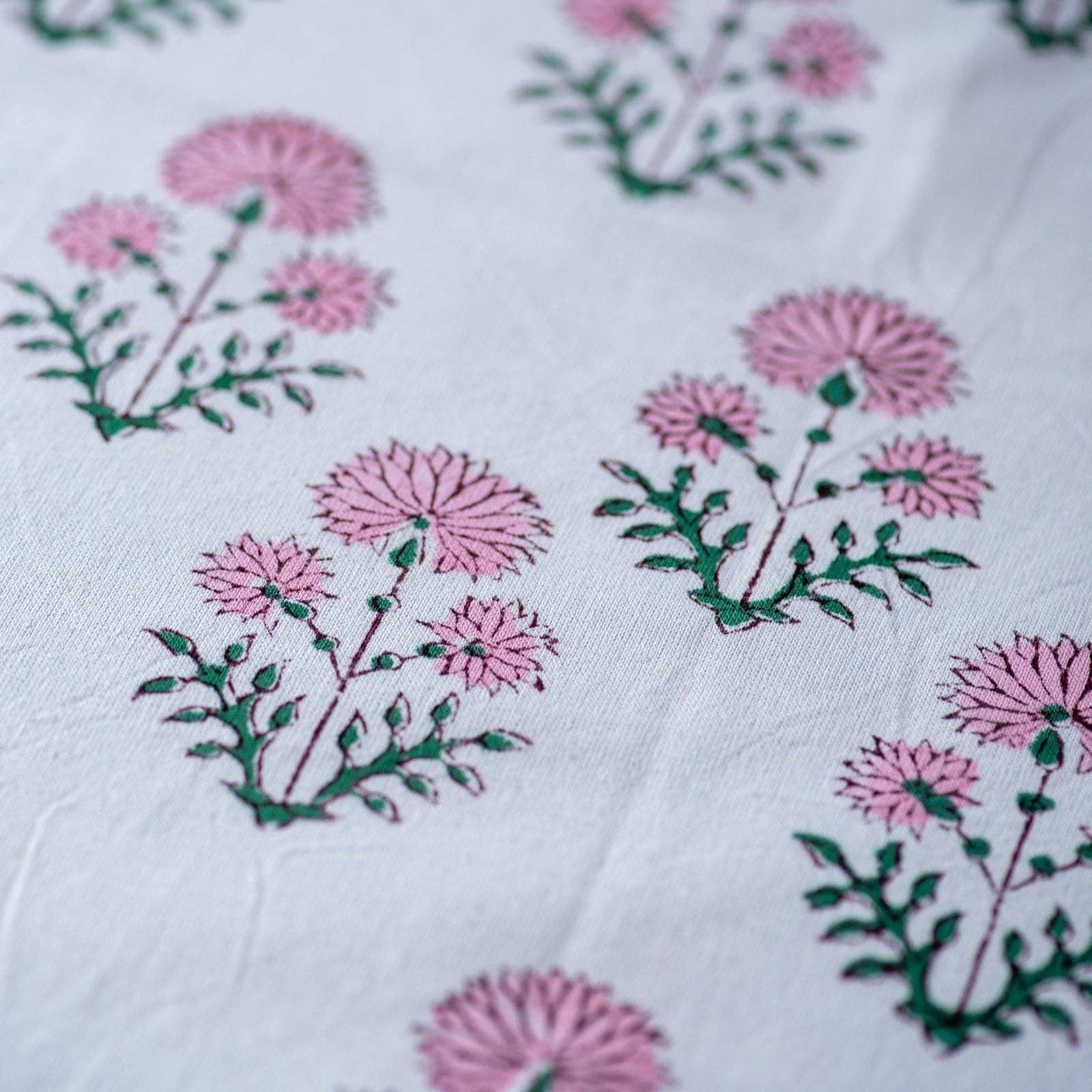 Pretty floral napkin with soft pink and dark green, hand block printed.