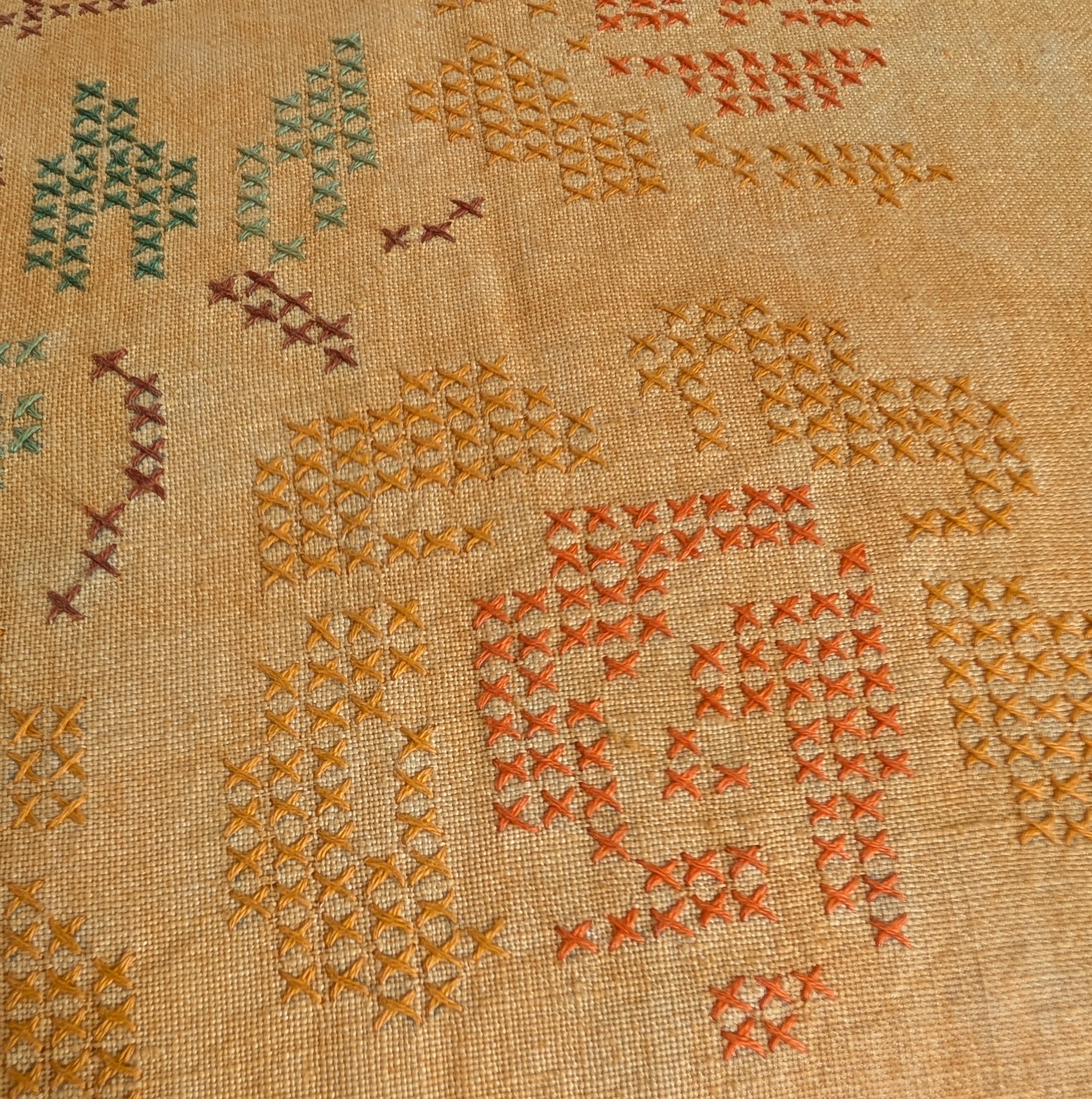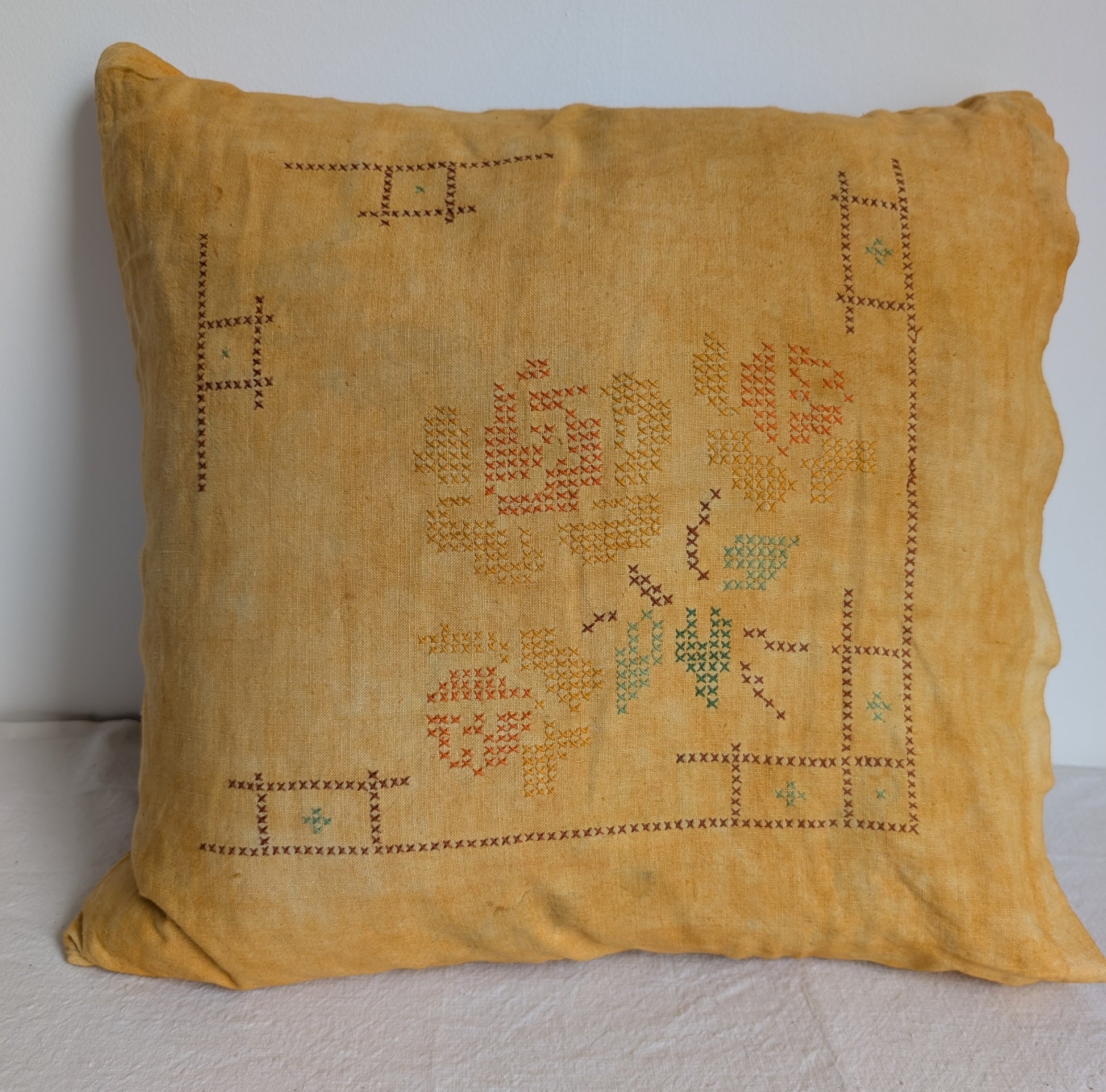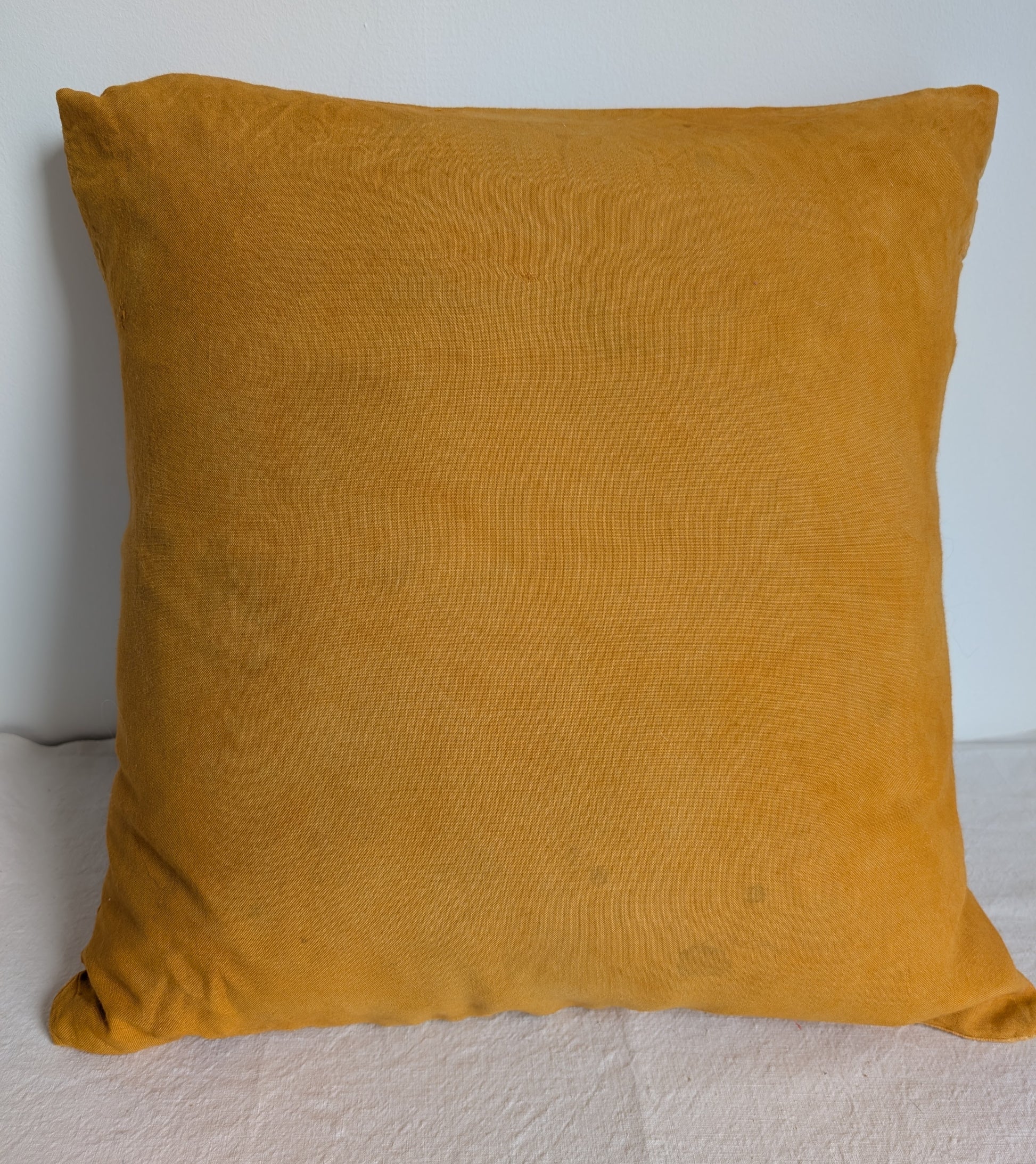 Enhance your home decor with a dark yellow hand embroidered cushion, hand made and dyed with natural coreopsis flowers for a vintage-inspired look. The 45 cm square cushion features a wide overlap closure. The cushion fabric is vintage cotton, featuring original hand embroidery.