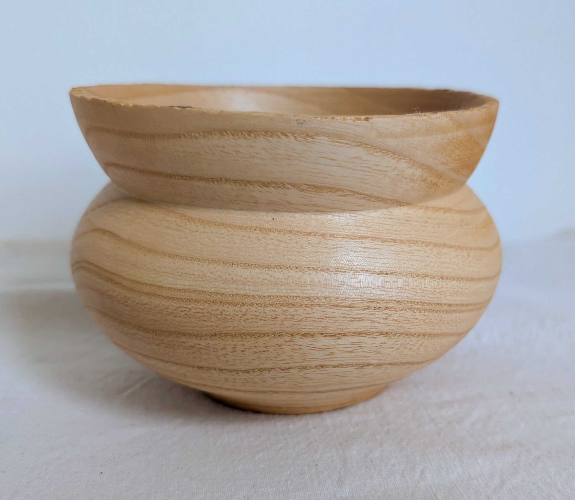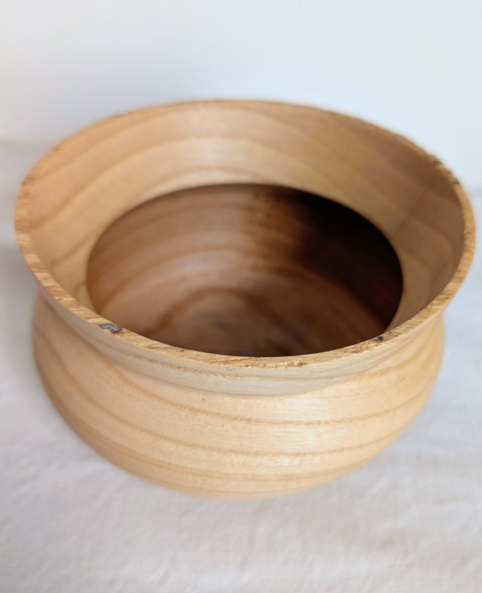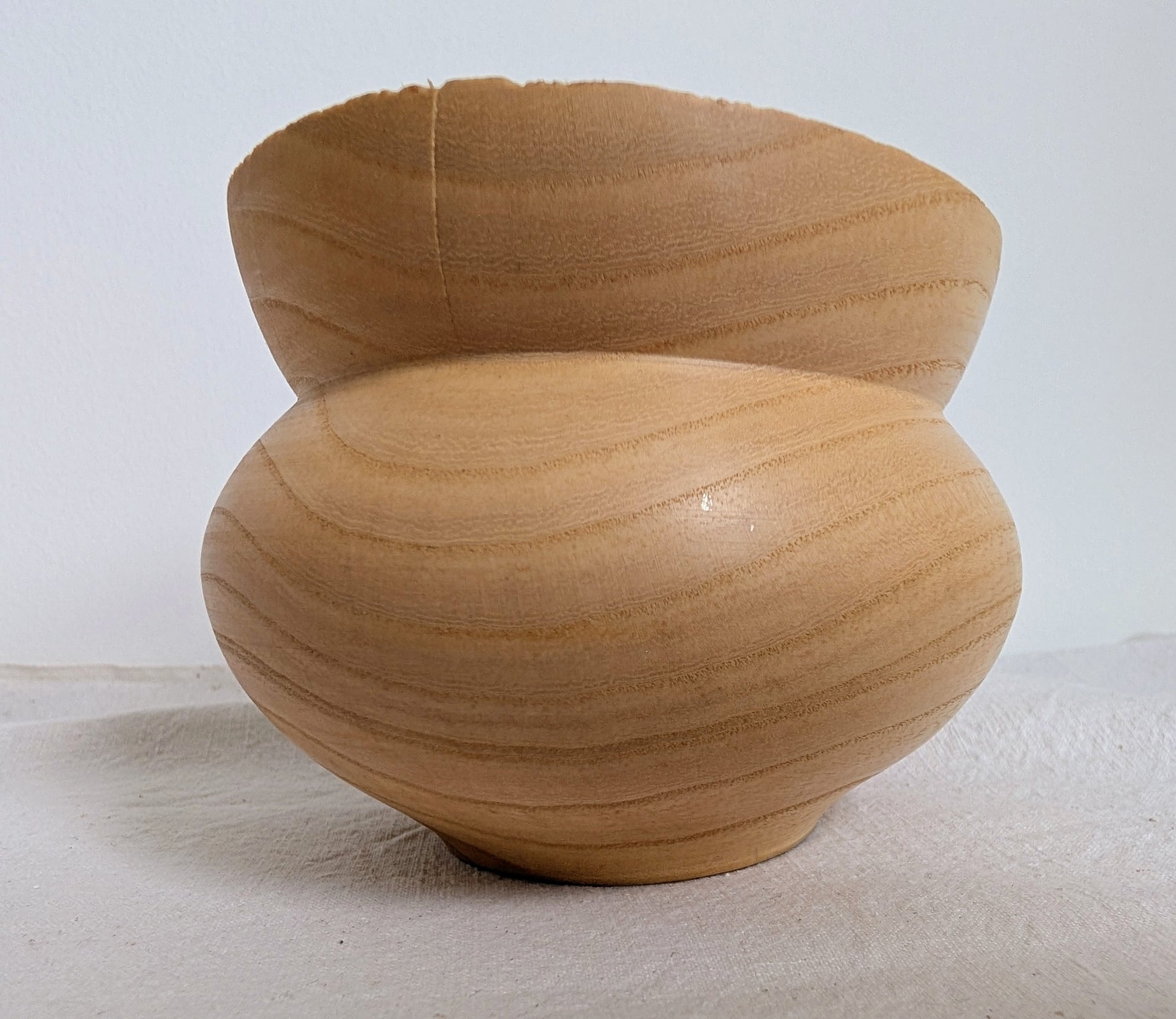 A small pale Ash form with a flared out neck. Turned by Jubal Prevatte.