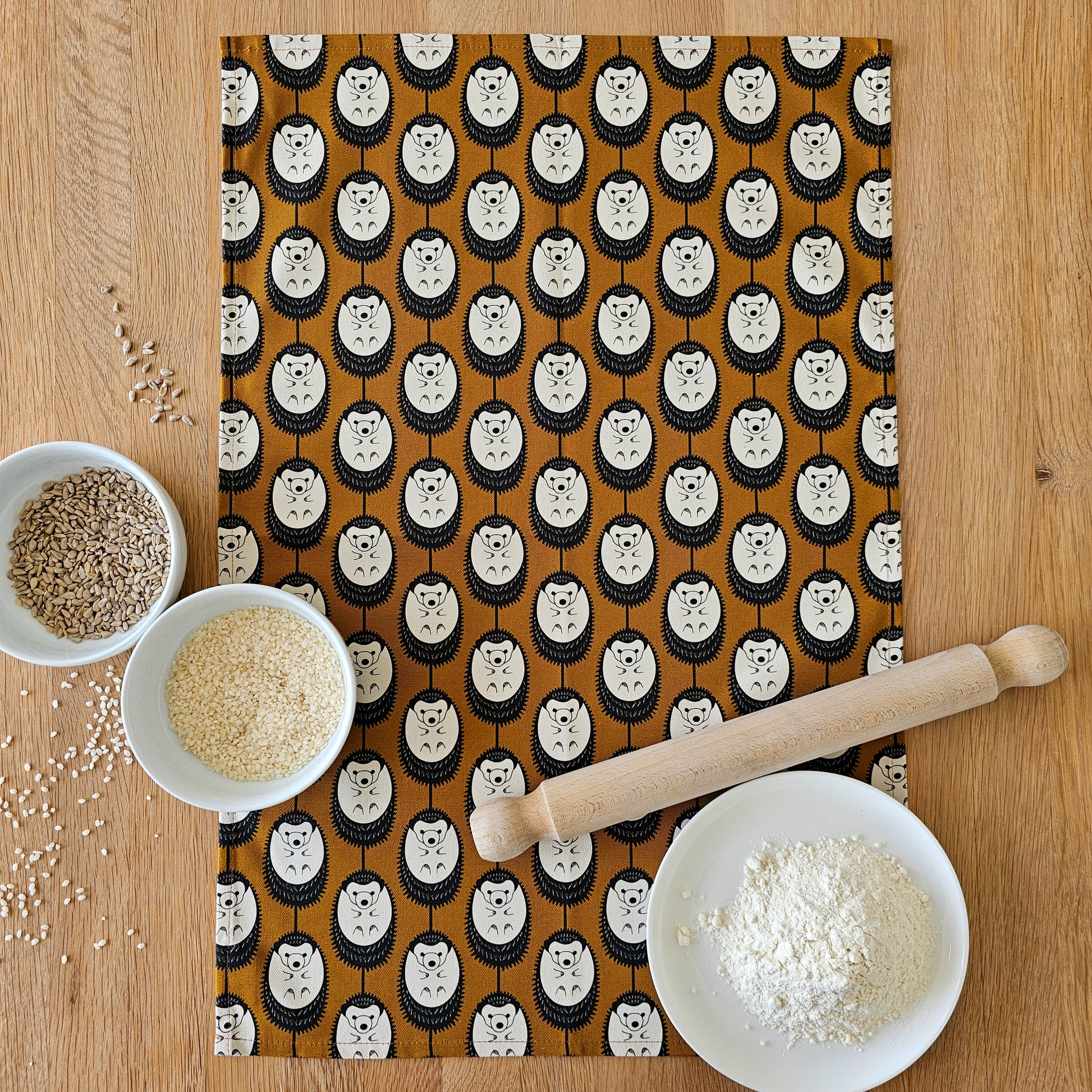This stylish and practical tea towel features Hannah Issi's Hedgehog pattern printed on a variety of backgrounds. The tea towel is printed and handmade in the UK using eco-friendly dyes and high quality natural organic cotton.