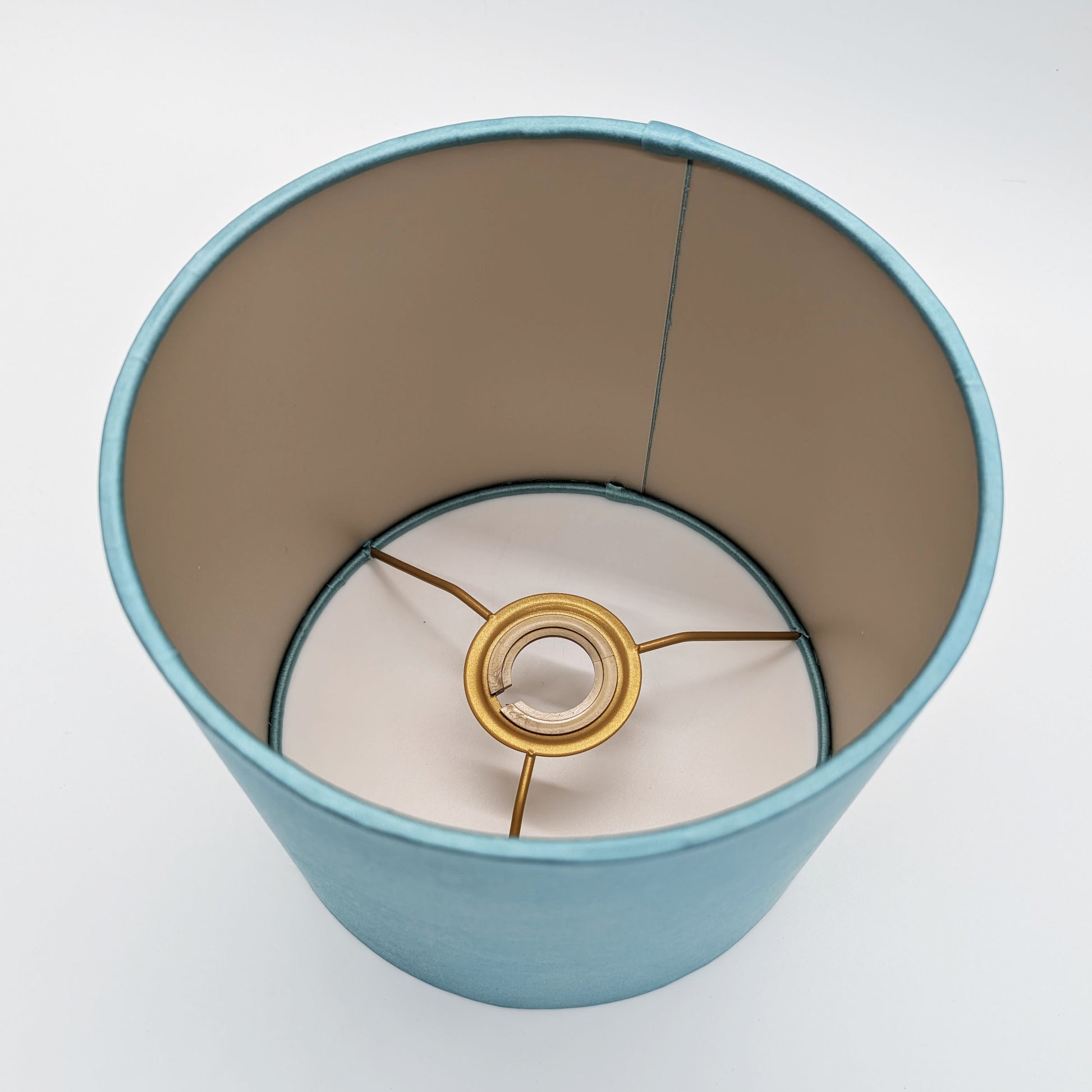 A unique 20cm drum lampshade dyed with locally grown fresh indigo on luxurious silk satin fabric.