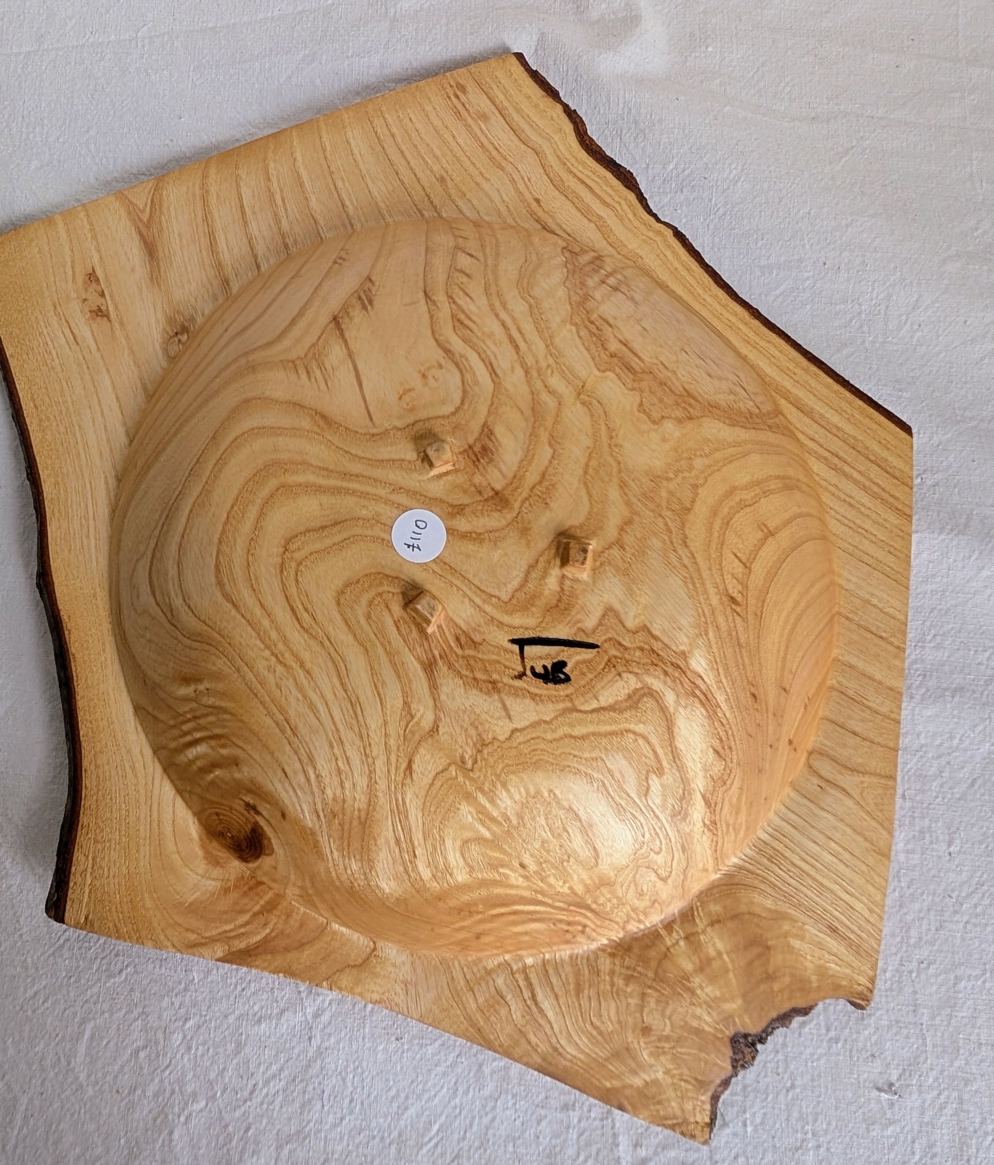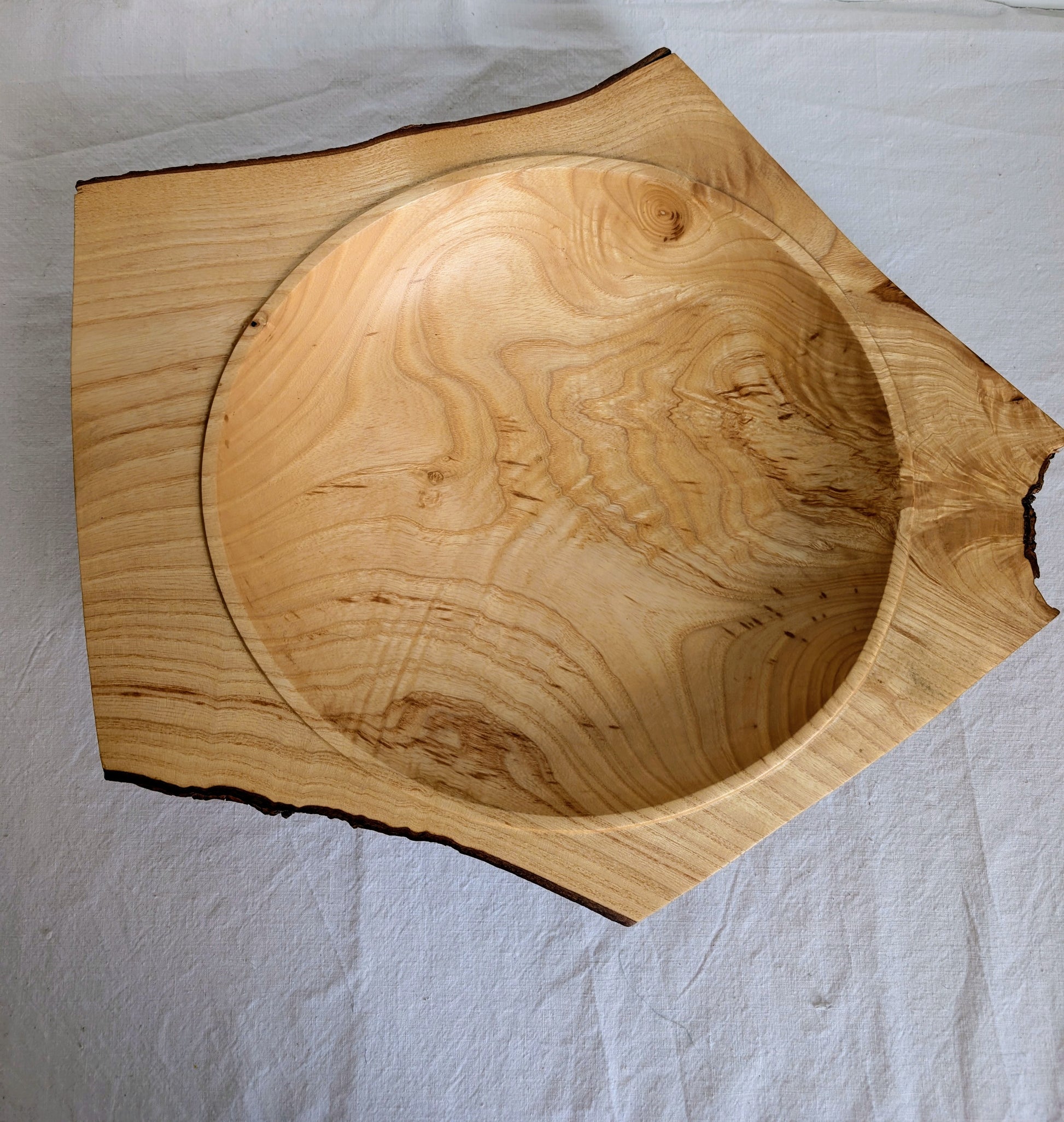 "Winged" ash bowl, with a surrounding broad lip and a live edge. Beautifully hand turned by Jubal Prevatte to create a low, wide bowl. 47cm wide at widest point, narrowing to 31cm. Bowl itself is about 29cm in diameter.