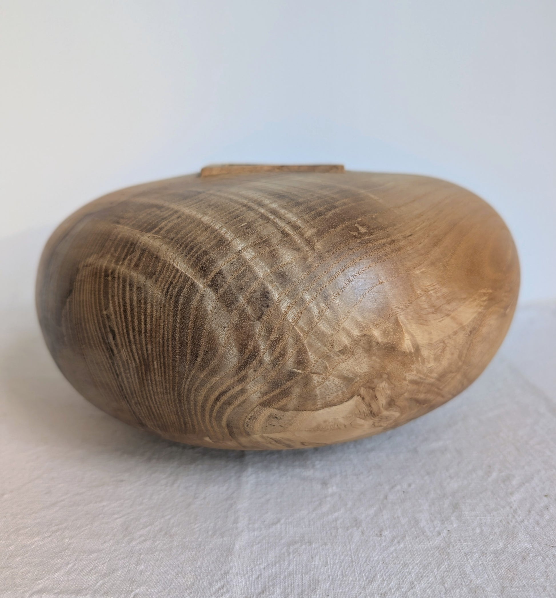 A figured Olive Ash form with a carved square neck and three small feet. A large, low, rounded shape. Turned by Jubal Prevatte.