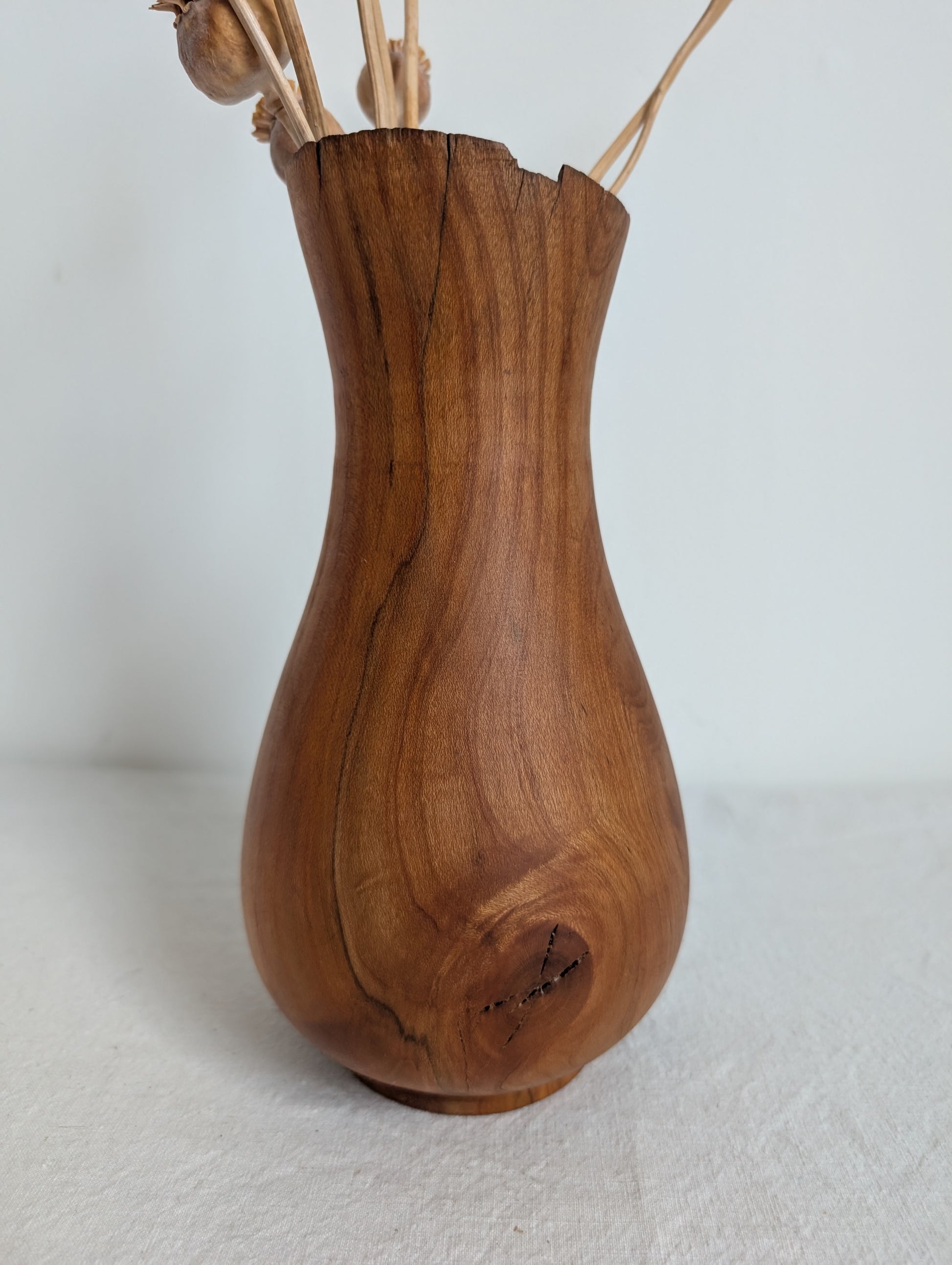A slightly flared neck carafe or vase, turned from Myrtle wood. Perfect for holding dried flowers.