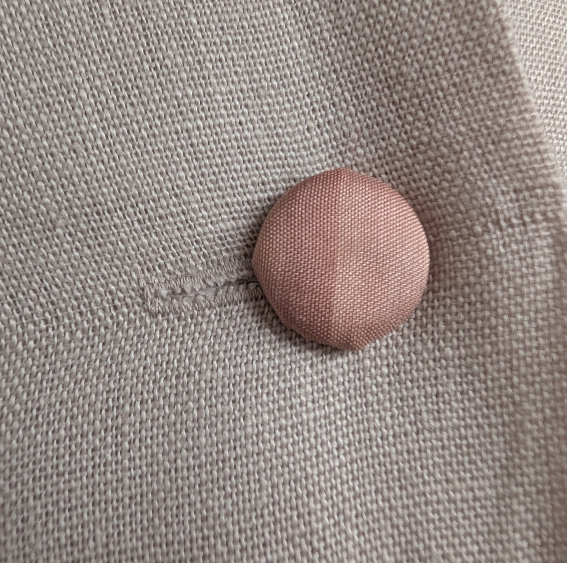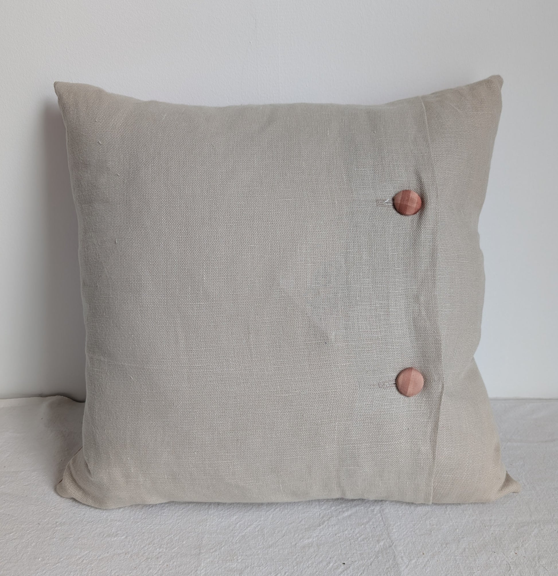 The 45 cm square cushion features a beige linen backing with a wide overlap closure and hand-covered buttons, ensuring both style and comfort. Ethically sourced feather and down fills the plush inner cushion for a luxurious feel.