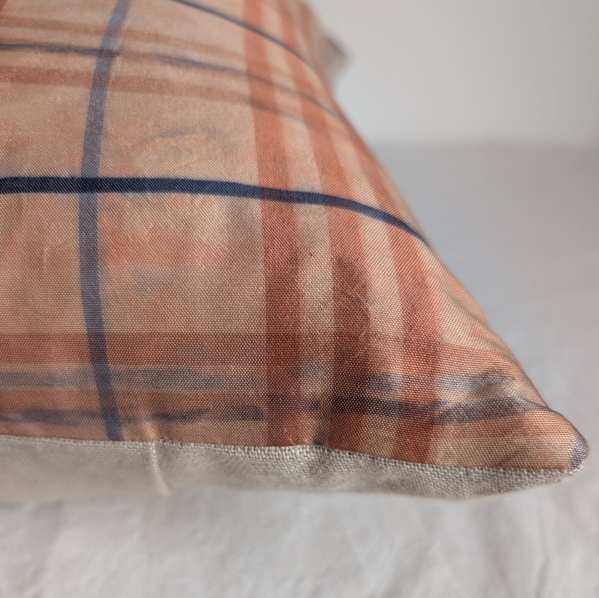 Enhance your home decor with a one-of-a-kind hand dyed checked silk cushion, hand made and dyed with natural avocado pits. Hand woven vintage silk was overdid to give a subtle pink and blue check.