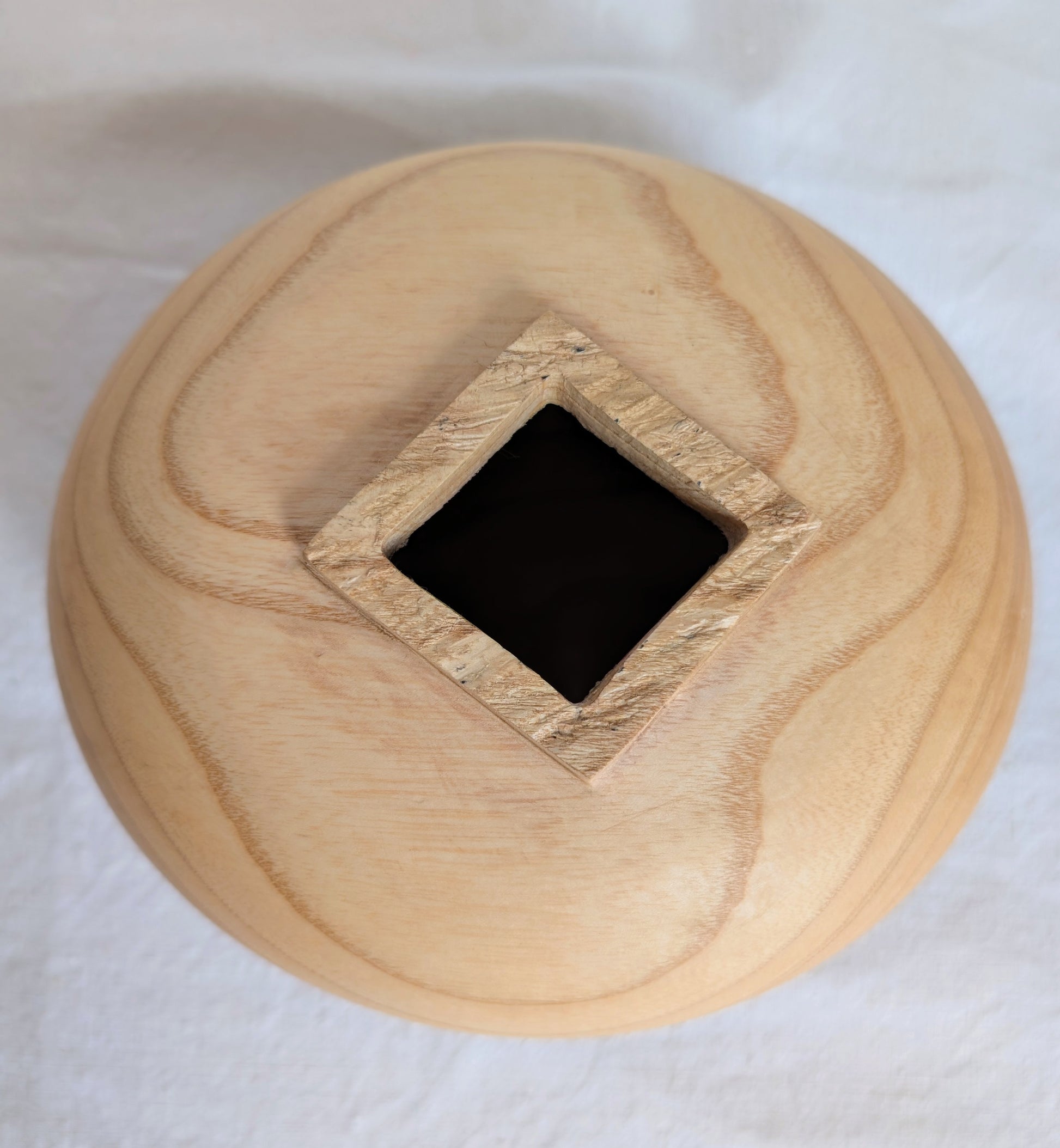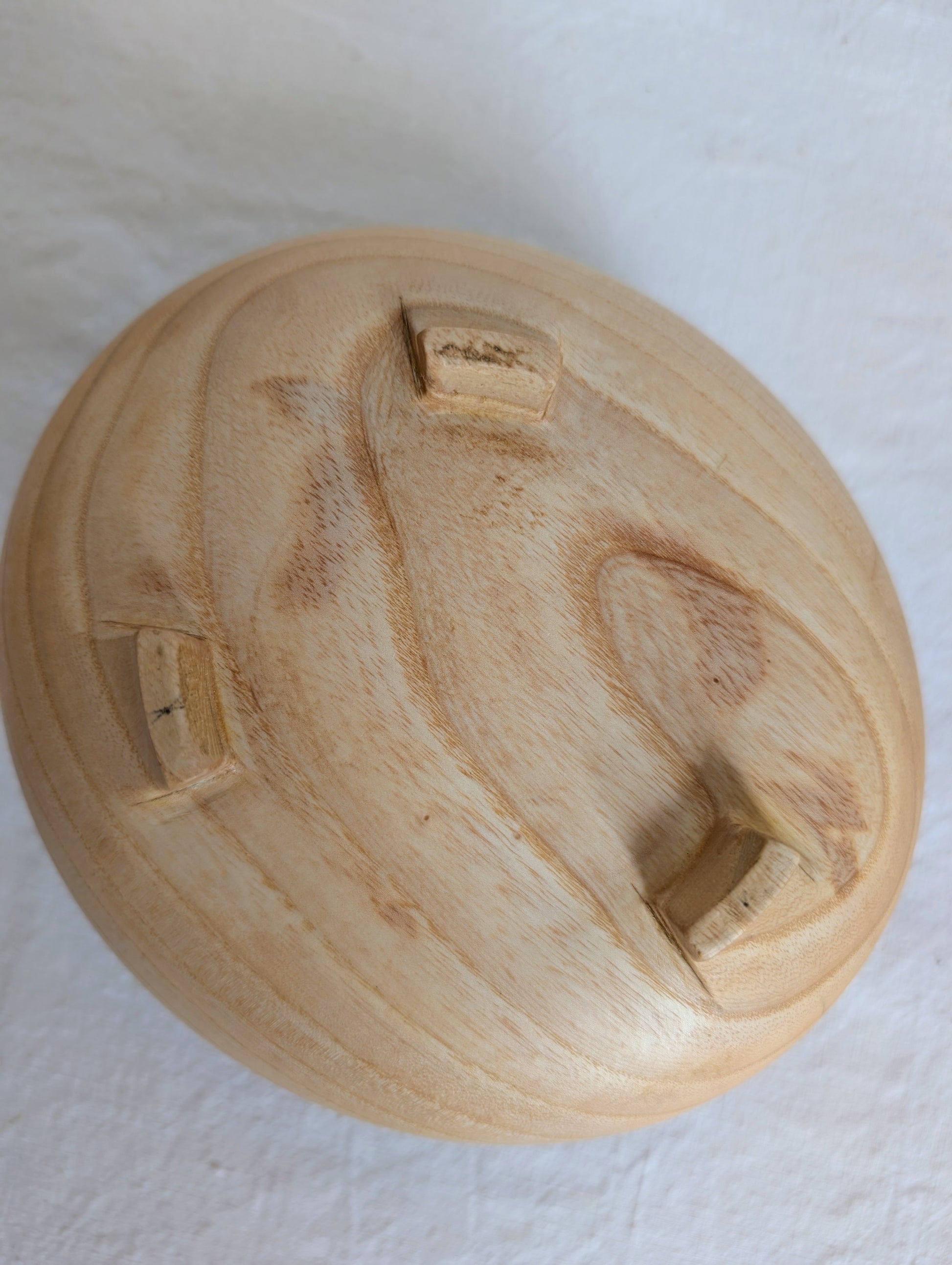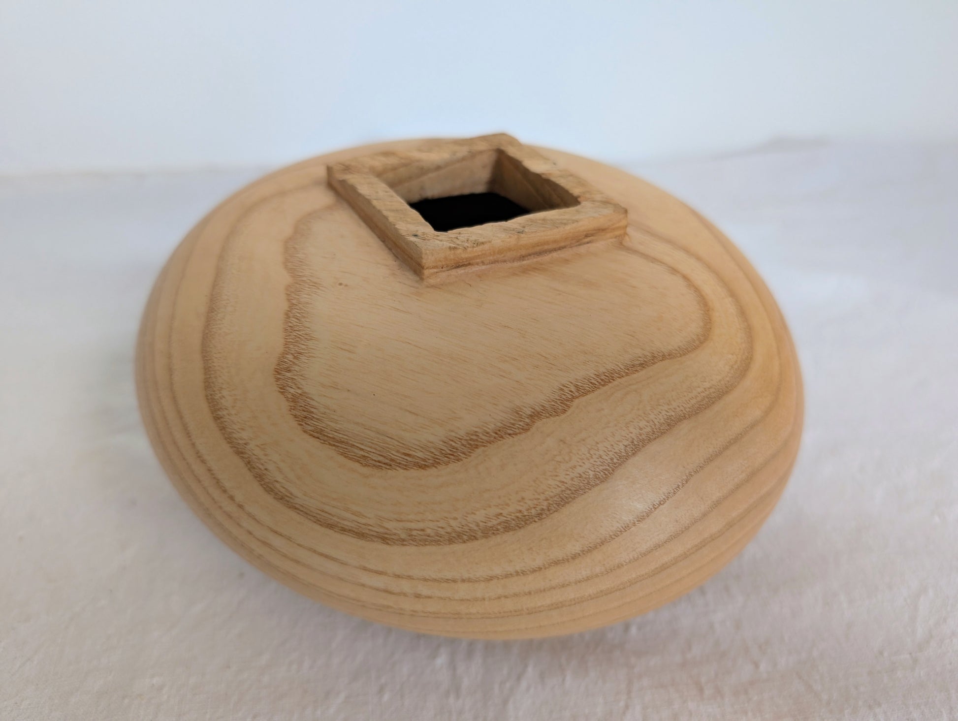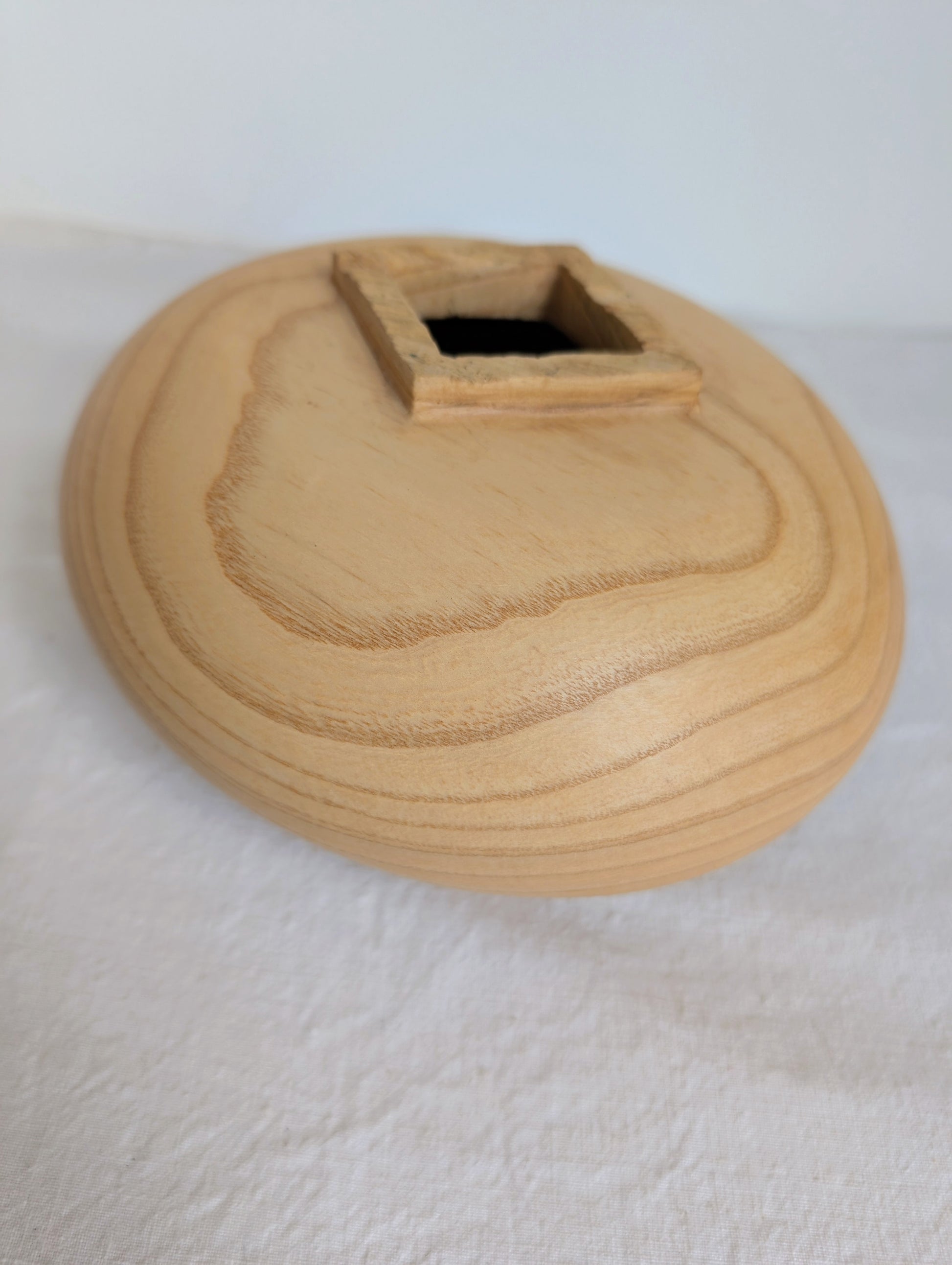 A rounded pale Ash form with a carved square neck and three small feet.. Turned by Jubal Prevatte.