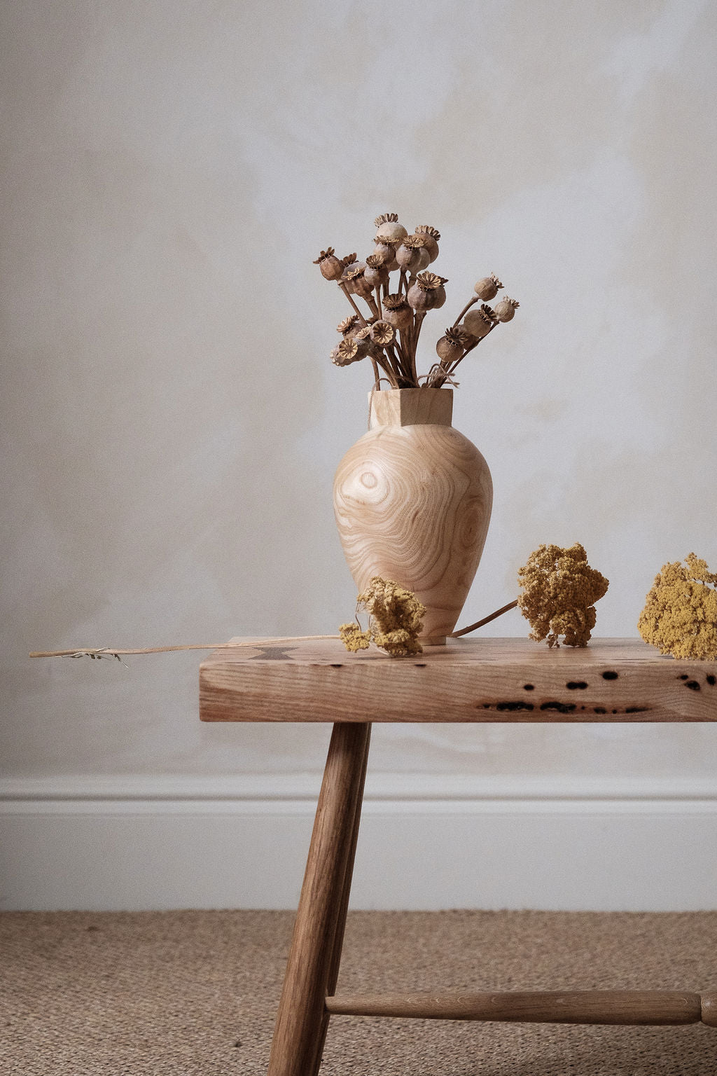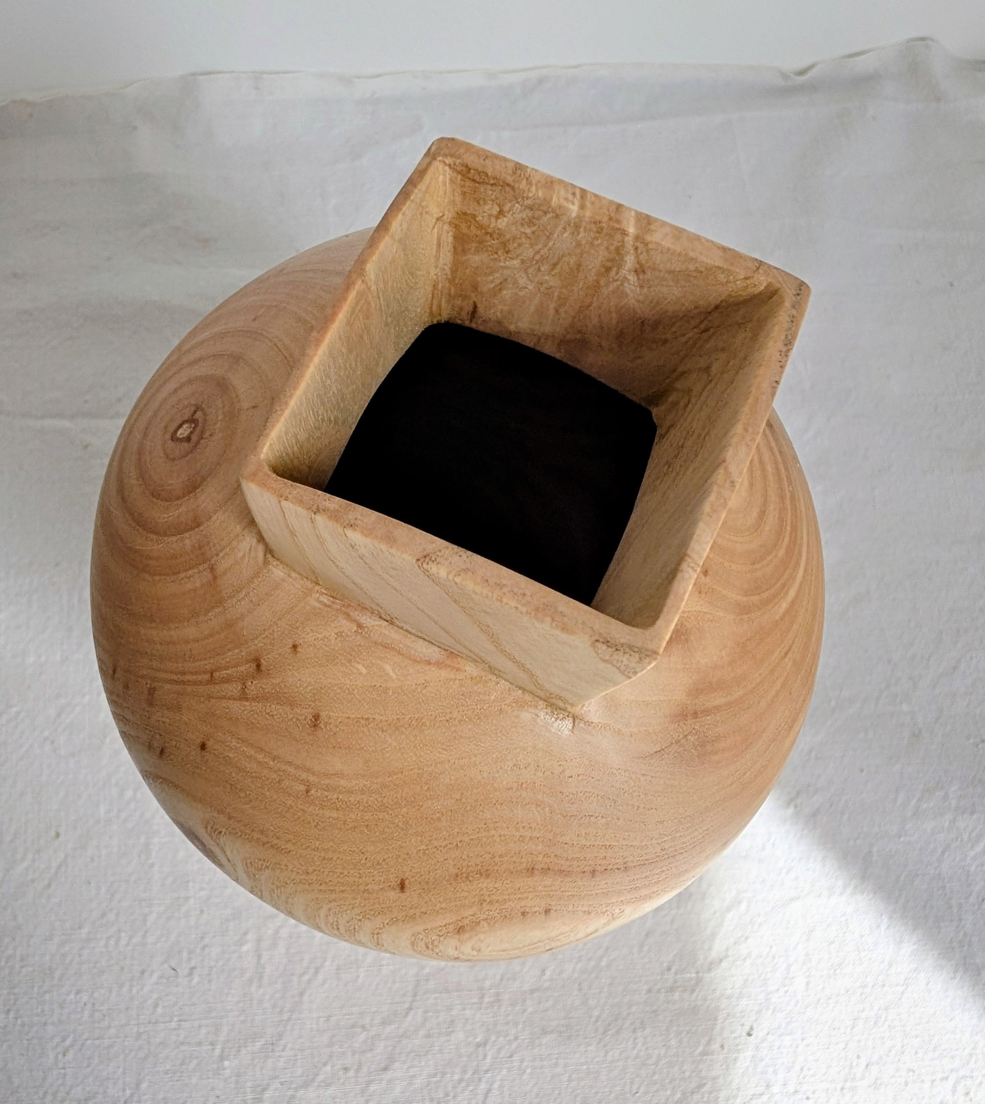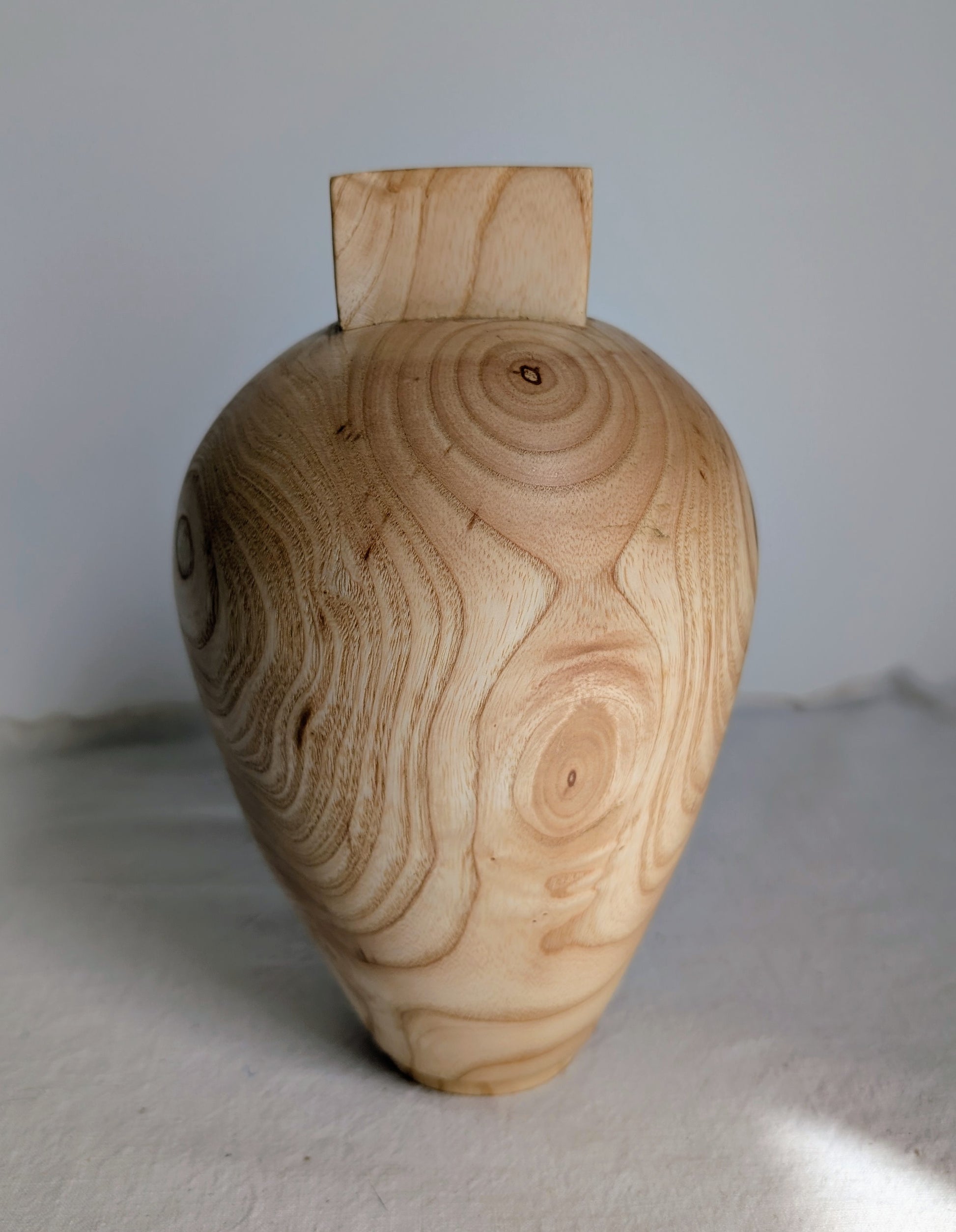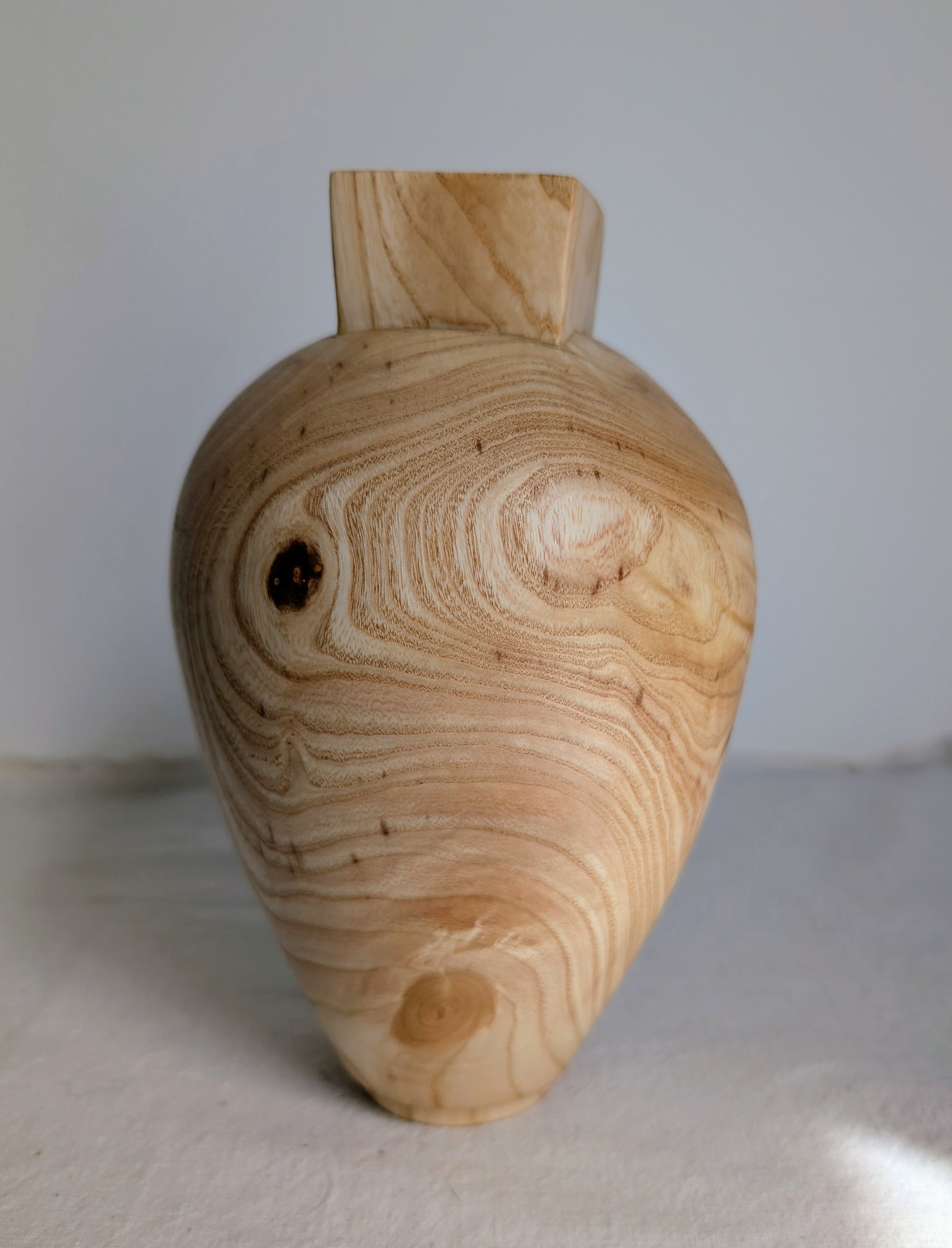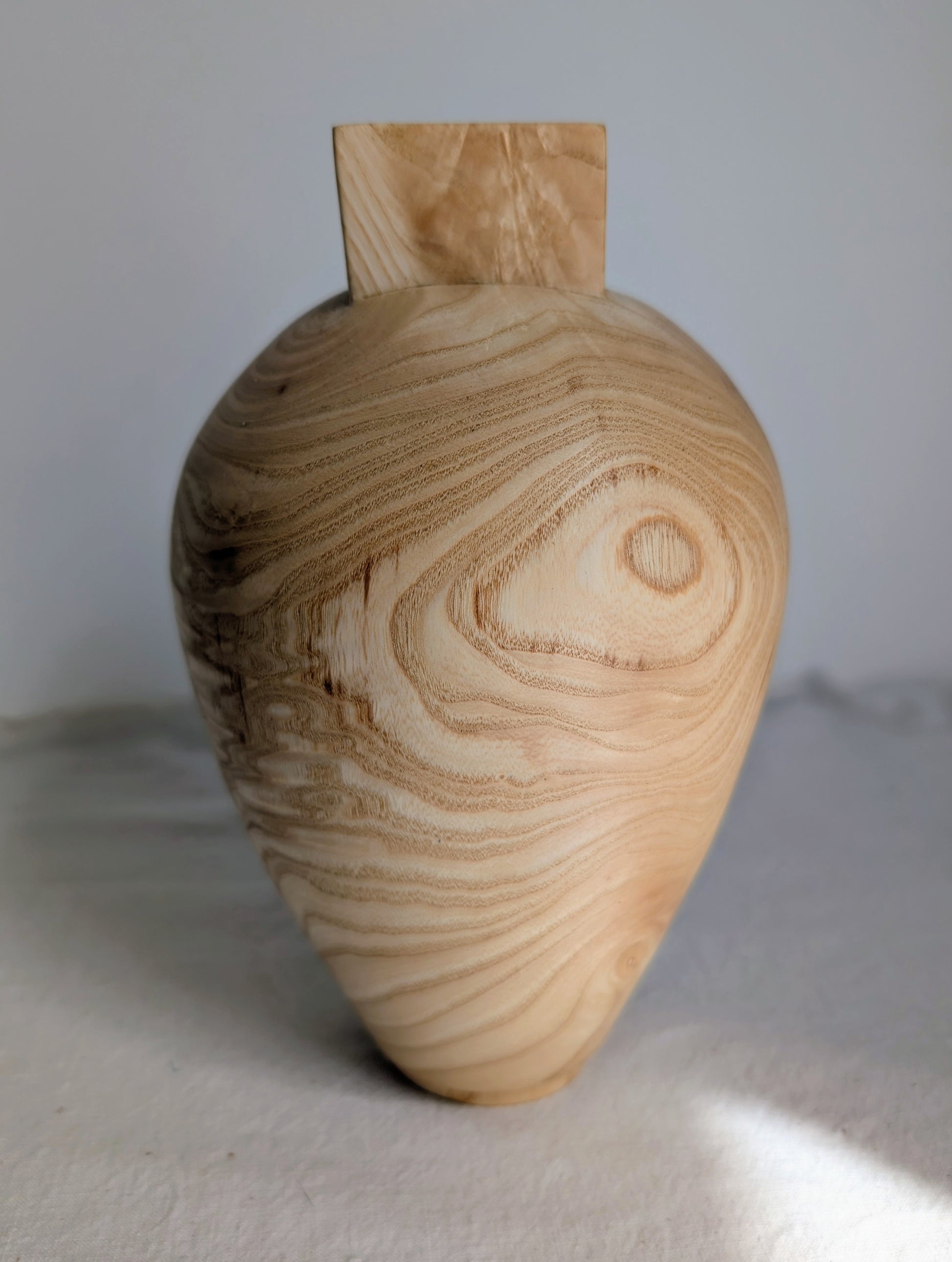 Beutifully shaped ash vase with a carved square top. Perfect for dried flowers